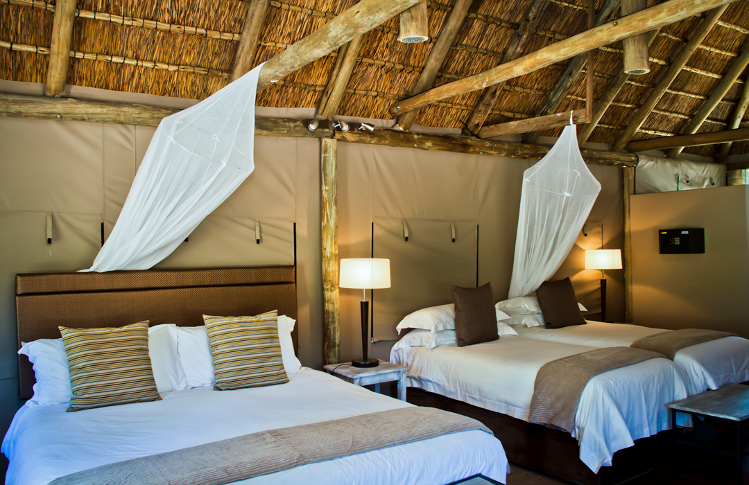 Our camp accommodates a total of 20 luxury thatched tents 16 on wooden decks, sleeping 2 guests and 4 family tents tailored for the comfort of 2 adults and 2 children.