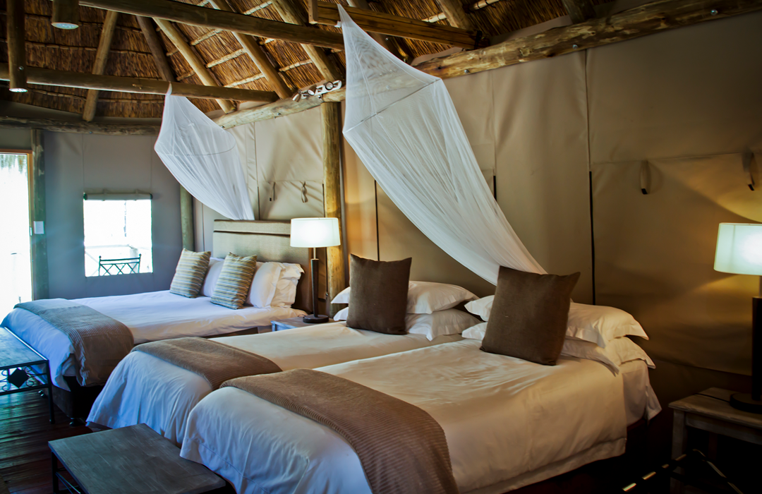 Our camp accommodates a total of 20 luxury thatched tents 16 on wooden decks, sleeping 2 guests and 4 family tents tailored for the comfort of 2 adults and 2 children.